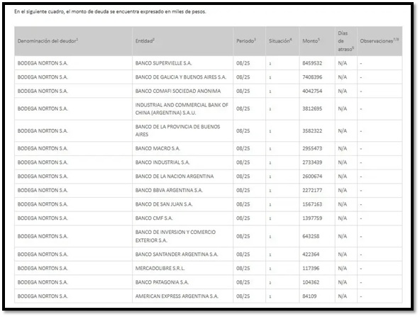 De acuerdo con los datos oficiales que publica el Banco Central de la República Argentina (BCRA), Bodega Norton S.A. poseería un total de 16 cheques rechazados en la Central de Deudores de la entidad, por un total de 42.203 millones de pesos, unos 30 millones de dólares al cambio actual.