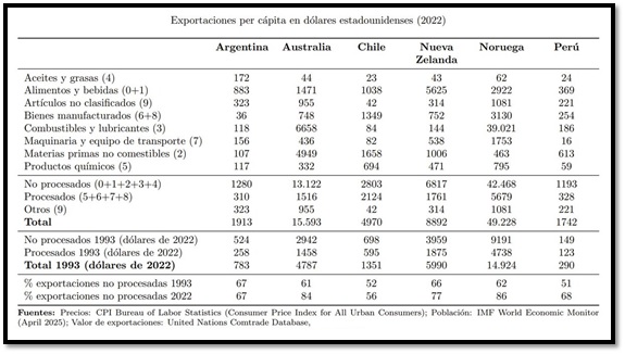 En particular, en 2022, la Argentina exportó un total de alrededor de 1.910 dólares per cápita, de los cuales 1.280 no estaban procesados, incluyendo alimentos, materias primas agrícolas, combustibles, minerales y metales, y 310 sí estaban procesados.
