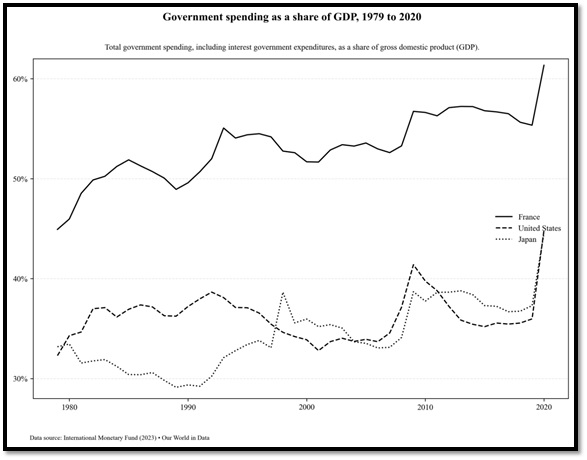 La evidencia empírica confirma esta tesis. El Gráfico 1: Gobierno Spending as a share of GDP, 1979 to 2020 demuestra que, a pesar de las proclamas de austeridad y desregulación, el gasto público total no disminuyó a lo largo de las décadas, sino todo lo contrario.