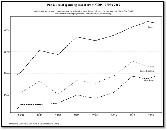 Este enfoque se extendió a la política social. El Gráfico 2: Public social spending as a share of GDP, 1979 to 2016 revela que el gasto en bienestar social también se incrementó: