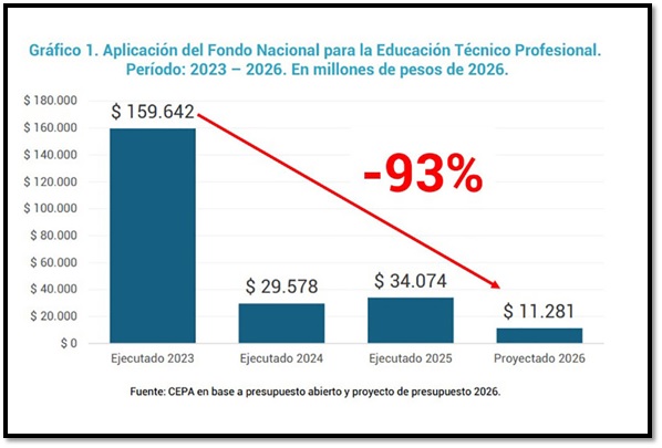 El recorte implica una reducción del 62% contra lo ejecutado en 2024 para el mismo destino y del 67% contra lo dispuesto durante 2025. En ambos ejercicios el ejecutivo no contó con un presupuesto aprobado por el Congreso y, por lo tanto, los fondos destinados a ese propósito resultaron de decisiones arbitrarias del ejecutivo. Ahora se busca consolidar esos recortes e incluso profundizarlos. El fondo financia la educación técnica en escuelas secundarias de todo el país.