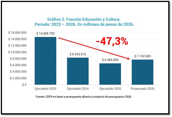 Además, puntualiza el informe mencionado, "el ajuste en la educación técnico-profesional se inscribe en un recorte presupuestario mucho más amplio". Es que, señalan, "la Función Educación y Cultura presenta una caída real del 47,3% en el Presupuesto 2026 respecto de lo efectivamente ejecutado en 2023".