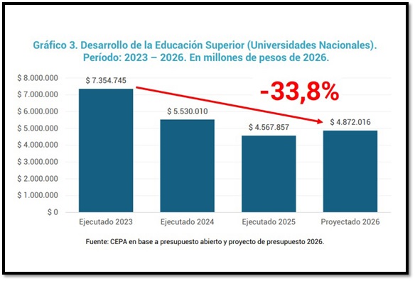 En la misma línea el ajuste presupuestario afecta también el acceso a la educación por la vía del recorte en fondos destinados a las becas estudiantiles. Para ese ítem el ajuste proyectado para 2026 implica una caída del 76,6% con relación a lo ejecutado durante 2023.