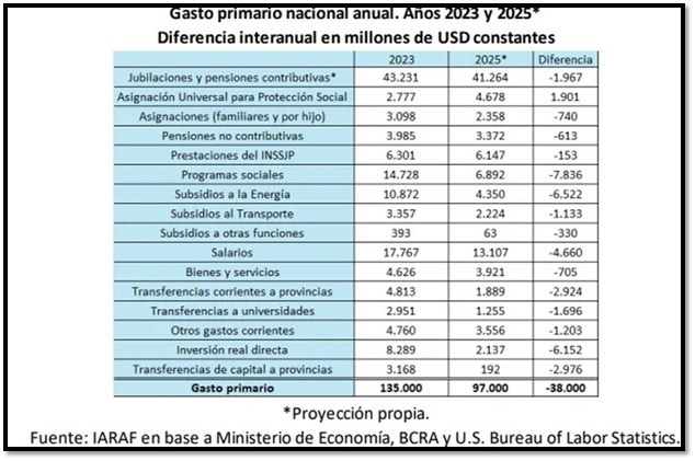 El IARAF señala que "el gasto primario nacional anual de 2025 tendría un descenso de $50 billones en moneda de noviembre de 2025, en comparación con el gasto realizado en 2023". "En términos de variación porcentual, la caída sería del 27%, es decir, del orden de la cuarta parte", señala el informe.