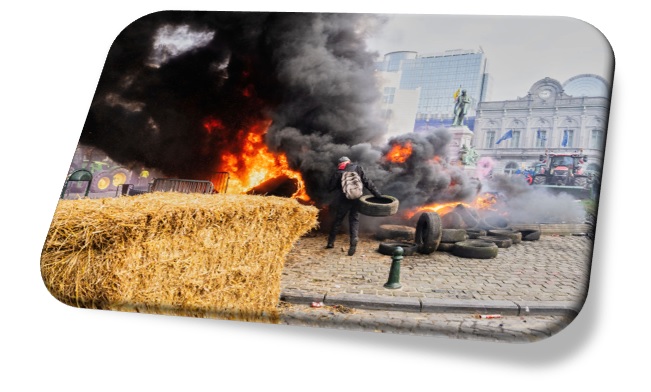 Barril ardiendo mientras agricultores europeos bloquean una carretera con sus tractores durante una protesta frente al Parlamento Europeo.