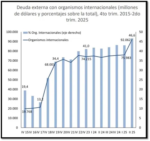 El total de la deuda con organismos internacionales contabilizó los 92.062 millones de dólares en el segundo trimestre de 2025, lo que representó el 46,6% del total de la deuda externa pública. Sus vencimientos son a muy corto plazo. "La exposición actual contrasta con la de la gran crisis de fin de siglo. Previo al Megacanje de 2001, la deuda con los organismos alcanzaba a 21.757 millones de dólares, lo que equivalía al 25,6% del total de la deuda en el año 2000", puede leerse en el trabajo de CIFRA.
