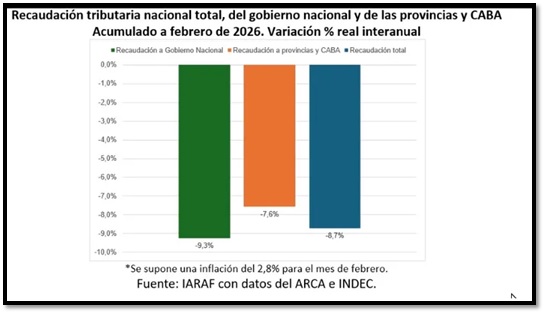 Según estimaciones del Instituto Argentino de Análisis Fiscal (IARAF), la recaudación que queda en manos de la Nación habría caído 9,3% real respecto del primer bimestre de 2025. En tanto, la porción que se dirige a las provincias bajó 7,6%.