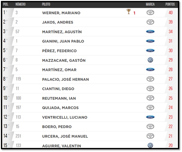 A partir de allí, el joven de Ramos Mejía intentó sobrepasarlo en varias ocasiones. Tomó la succión en la recta principal para obtener mayor velocidad, pero no le alcanzó. De todas formas, Jakos consiguió un magnífico segundo puesto, que lo coloca 2° en el campeonato a sólo una unidad de Werner.