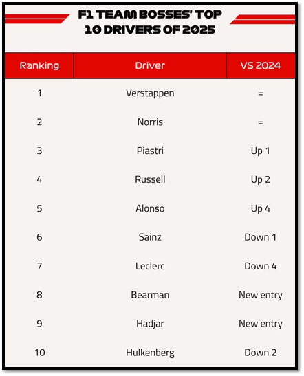 Al igual que sucedió durante el 2024, los primeros dos puestos del ranking no sufrieron cambios. En la cima de la lista figura Max Verstappen, quien mantuvo la preferencia de los directores a pesar de perder el título mundial de F1 luego de ser el monarca tras sus consagraciones en cuatro temporadas consecutivas del 2021 a 2024. El piloto neerlandés logró seis victorias en los últimos nueve GP del año y consolidó su reputación entre sus colegas como el piloto más sólido de la temporada. Llegó a la definición en Abu Dhabi con chances de coronarse, pero perdió el número por dos puntos en manos de Lando Norris (423 a 421).