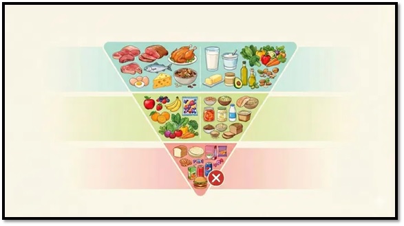 La nueva pirámide (2026) en lugar de enfocarse en el balance de calorías o en grupos de alimentos en porciones iguales, el nuevo modelo prioriza la calidad de los alimentos, la densidad de nutrientes y los ingredientes mínimamente procesados.
